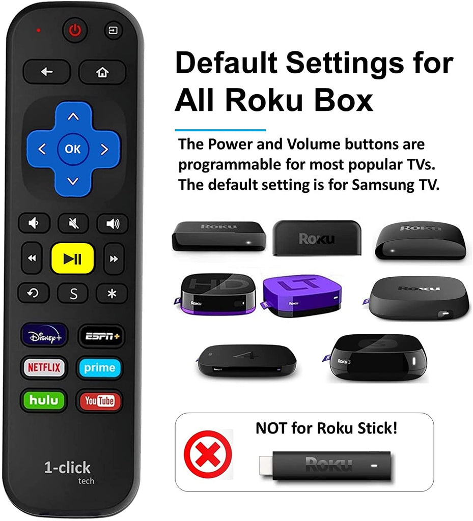 - 【2-in-1 w/ TV Functions - EASY Setup】1-clicktech iKuTV-U7 is a universal IR replacement remote for ROKU EXPRESS and other Roku box players with 5 TV control buttons(Power, Volume+/-, Mute, Input). The precoded TV brands include Samsung (default), Vizio, LG, SONY, SHARP, Philips, Toshiba, Panasonic, Insignia, Dynex.